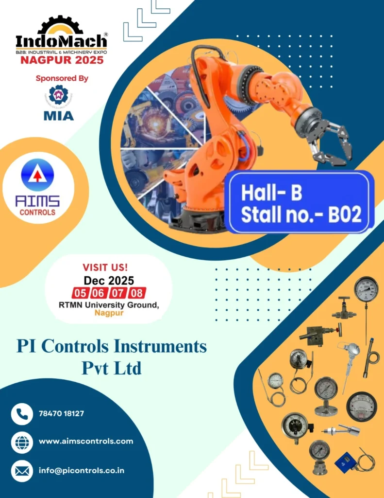 Join PI Controls Instruments Pvt Ltd at the IndoMach Industrial & Machinery Expo 2025, happening from 5th–8th December 2025 at RTMN University Ground, Nagpur. Visit us at Hall-B, Stall B02 to explore our wide range of industrial instruments, automation solutions, and control systems. Sponsored by MIA and powered by AIMS Controls, we bring innovation and precision to the future of industrial machinery.